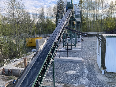 Ленточный конвейер имеет рамную конструкцию с фермами. В нижней и верхней части ленточного конвейера устанавливаются барабаны с футеровкой, ведущий барабан приводится в движение при помощи червячного мотор-редуктора. Конвейерная лента шевронная закрытого типа. В нижней части конвейера имеется приемный бункер, конвейер имеет от бортовку, это необходимо чтобы инертные материалы не просыпались с ленточного конвейера при транспортировки инертных материалов в бетоносмеситель. Все конвейерные ролики оцинкованные.