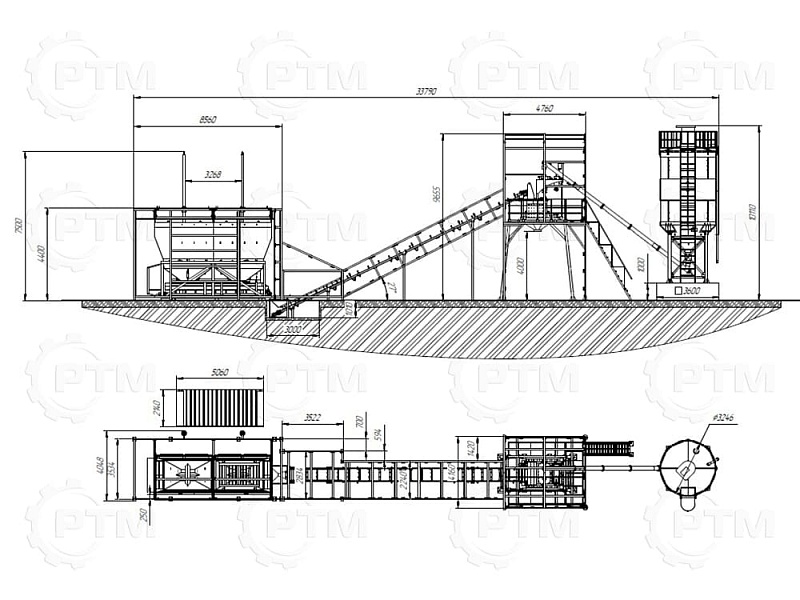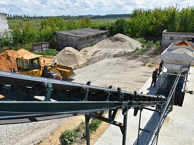 2. После набора нужного количества материалов инертные попадают на наклонный ленточный конвейер с шевронной лентой. Ширина ленты 600 мм, длинна конвейера 16 метров.