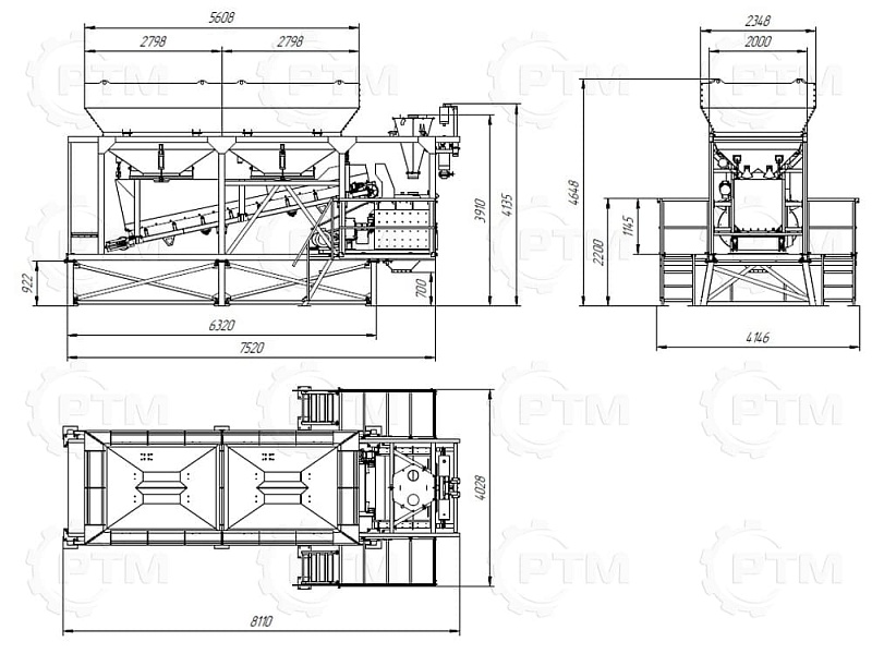 1. Дозирующий комплекс МБ-24 (2 секции по 12 м3): состоит из двух до четырех бункеров для хранения инертных материалов (щебень, песок, отсев). На каждом бункере имеется два пневмо- затвора, необходимых для точной дозации материалов. При дозировании материалы попадают на весовой ленточный конвейер, весовые датчики фирмы CAS Ю.Корея, при наборе нужного количества материалов, заслонки закрываются, подача прекращается. Объем каждого бункера от 2,5 м3 до 20 м3, в зависимости от комплектации завода. Каждый бункер оснащен вибродвигателем MVE 300/3.